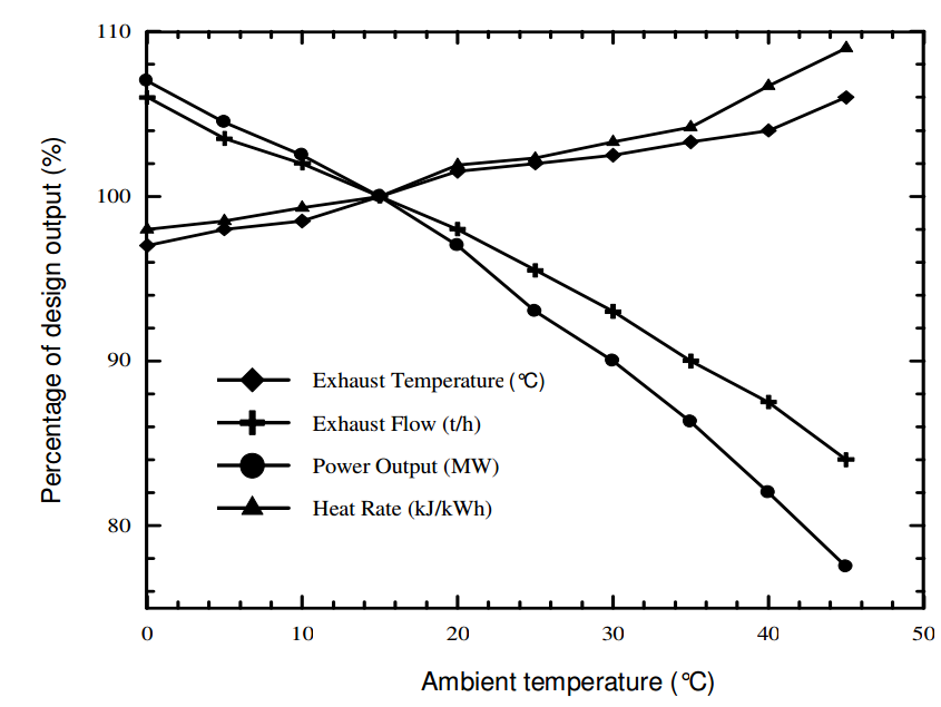 For every K rise in ambient temperature above ISO conditions the Gas Turbine loses 0.1% in terms of thermal efficiency and 1.47 MW of its Gross (useful) Power Output.