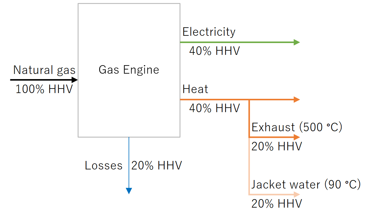 The recoverable heat generated in a gas engine is split roughly half high grade (>500°C), half low grade (<100°C).