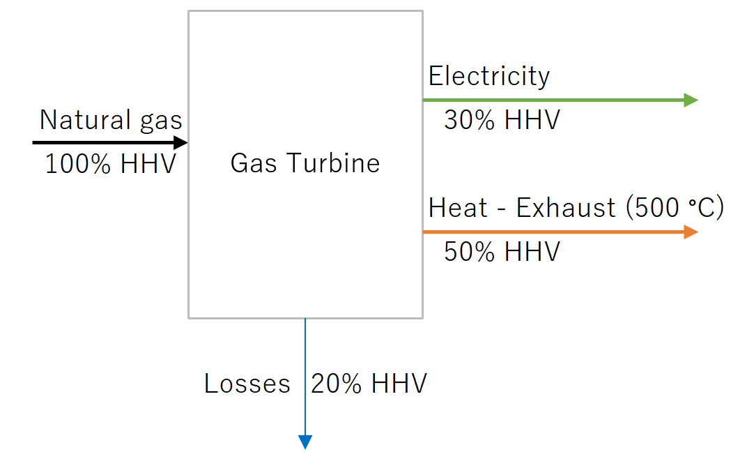 A gas turbine generates roughly twice as much heat as power - i.e. the heat to power ratio is around 2:1.