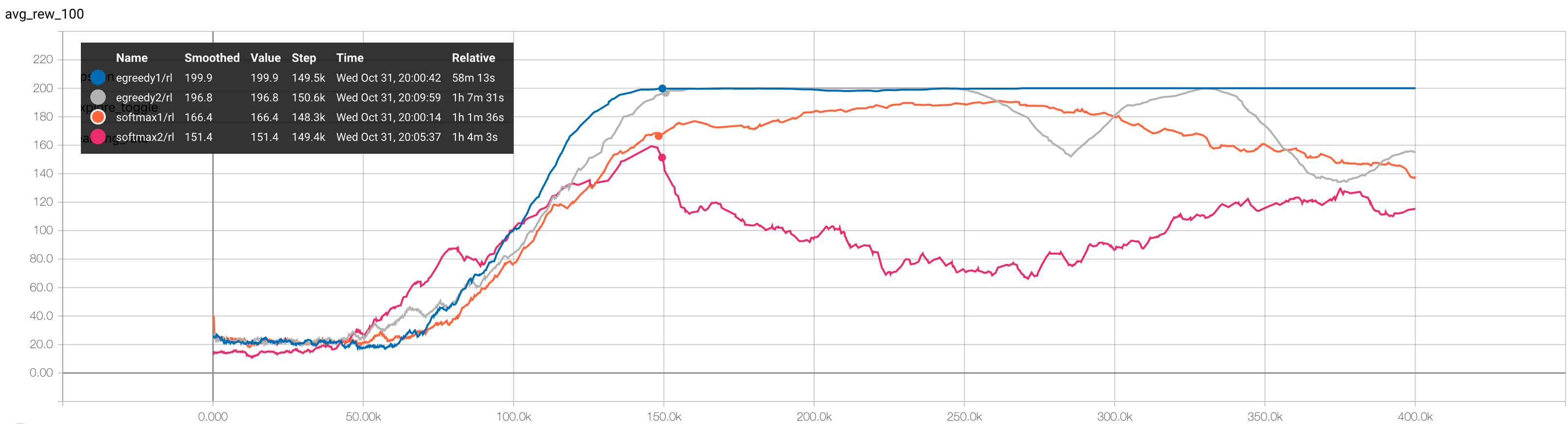 The performance of the four agents is shown below in Figure 1. This environment (Cartpole-v0) is considered solved when the agent achieves a score of 195 over 100 consecutive episodes - which occurred after around 150,000 steps for the epsilon-greedy agents.
