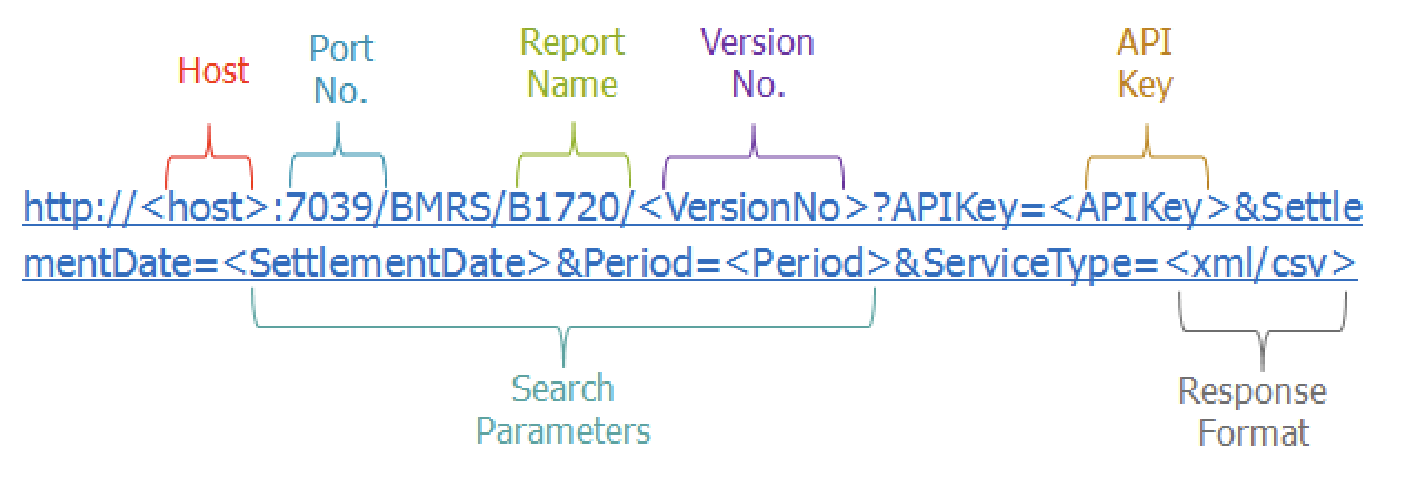 We will need to specify a few things to get the data we want: the report name (like B1770), our API key, the settlement date (like 2020-01-01) and the data format we want back (either XML or CSV).