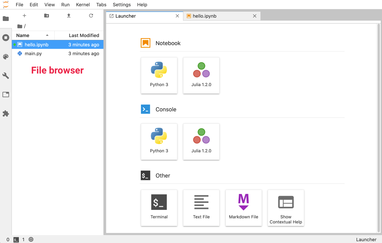 You can then point your browser to http://localhost:8888/lab, and you’ll see the Launcher screen, shown below with the File Browser open in the sidebar: