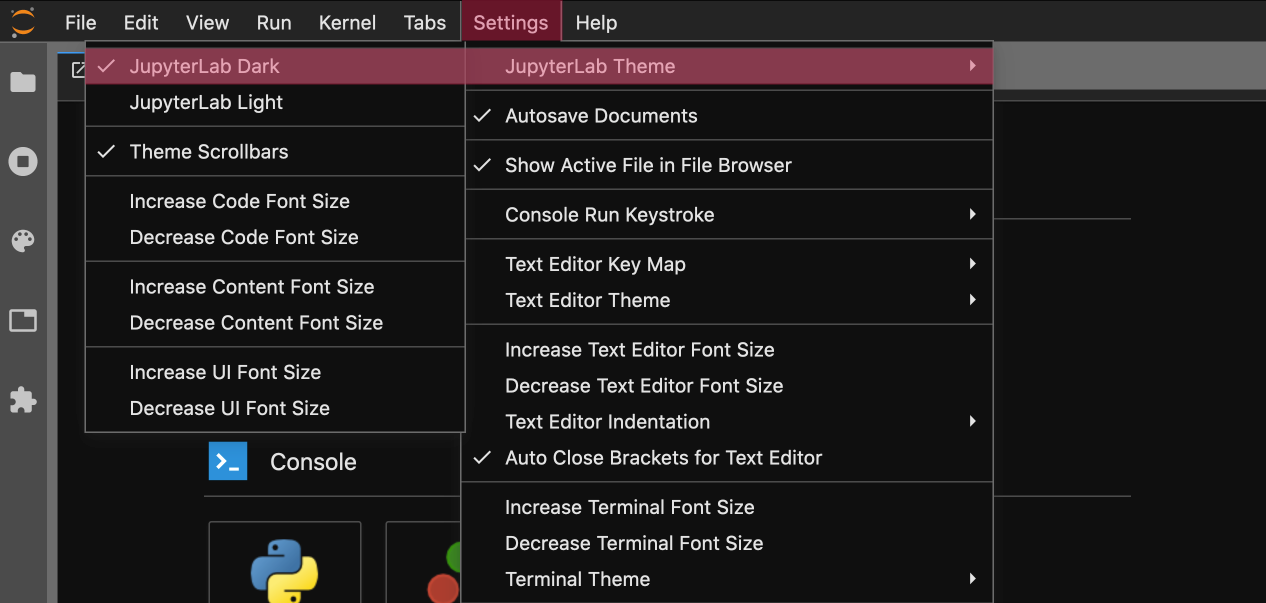 Kernels can be managed from the menu bar - restarting kernels is something that is done a lot. Unfortunately there are no default shortcuts setup for kernel management - see our post on Customizing Jupyter Lab Shortcuts to see how to set these up.